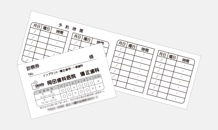 岡田歯科医院様の診察券を新たに制作いたしました。 今回のご依頼は、既存の診察券の増刷に伴う内容改訂を含んでおりましたが、以前のデザインを活かしたままの改訂となりました。具体的には、診療時間の表記を最新のスケジュールに合わせて更新し、予約の案内についてはレイアウトを微調整いたしました。 「診察券」は財布に収まる小さなカード1枚に、医院の印象やブランディング、更には患者さんの利便性が詰まっています。 診察券の素材の選択肢はプラスチック製やリライトカードなど多様化していますが、紙素材の診察券は、筆記性が高く、次回の受信日時を書き込むことに適しており、定期的な通院が必要な歯科や接骨院・整体院などで好まれる傾向にあります。また、紙素材は環境に優しい選択肢として、多くの場面で再注目され、紙素材は持続可能性の観点で高く評価されています。